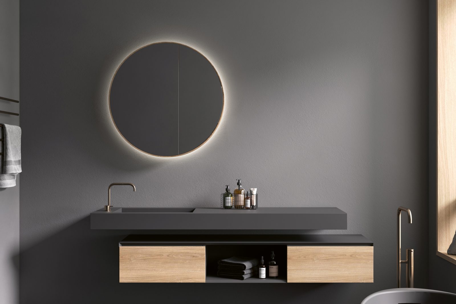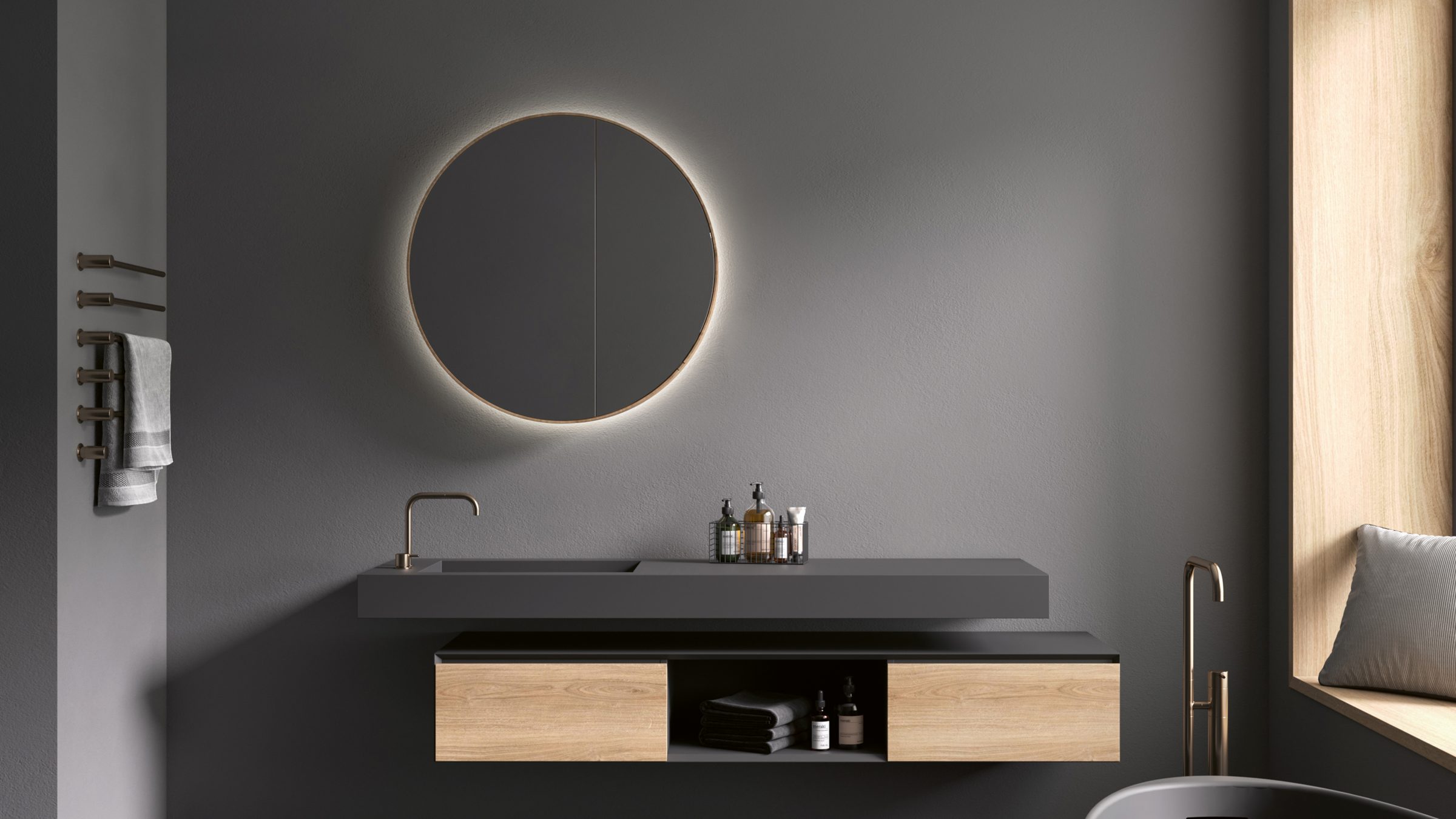 Unser MIRR5 LUNA kann optional mit LED hinterleuchtet werden. Dadurch entsteht eine Ambientebeleuchtung, die das besondere Design des runden Spiegelschrankes unterstreicht und ihn gekonnt in Szene setzt. Der MIRR6 FRAME ist mit einem umlaufenden LED-Profil im Spiegel ausgestattet, welches gleichzeitig eine direkte sowie indirekte Beleuchtung ermöglicht und so für optimale Lichtverhältnisse sorgt.