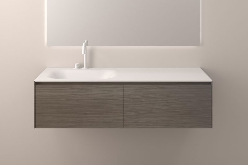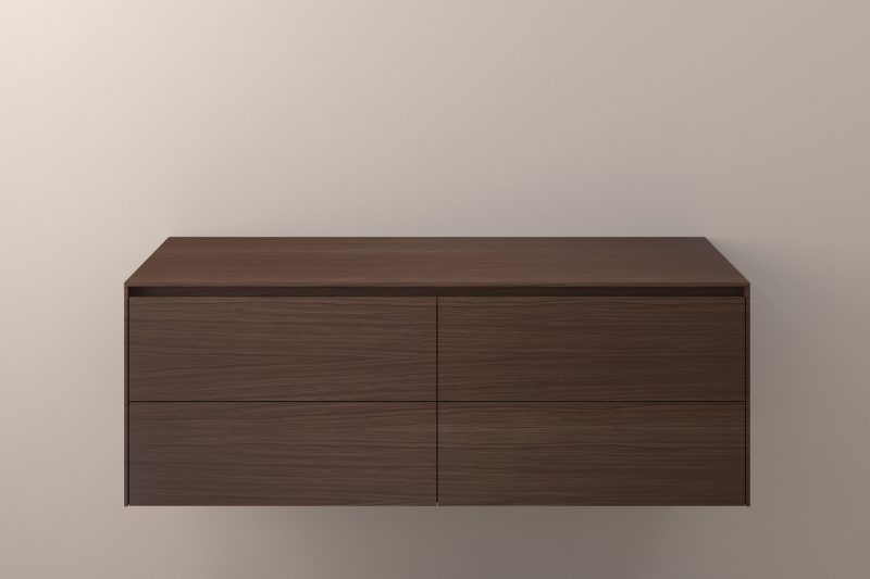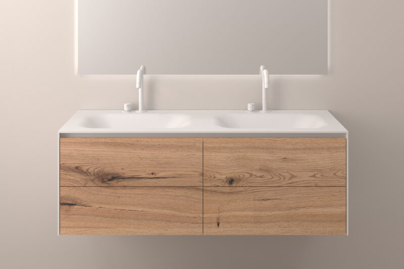 Die passenden Unterschränke sind in verschiedenen Echtholzfurnieren oder matt lackiert erhältlich. Neben 30 Standard Farbtönen bieten wir auf Wunsch auch Lackierungen in sämtlichen NCS- und RAL-Farben an – so entstehen Kombinationen, die sich harmonisch in jedes Badkonzept einfügen.